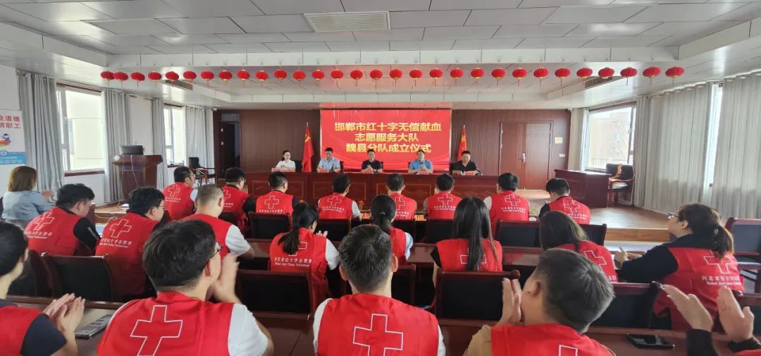 9月20日上午,邯郸市红十字无偿献血志愿服务大队魏县分队成立。市红十字无偿献血志愿服务大队队长、市红十会副会长李军刚,市中心血站党委书记、站长杨小岗,市中心血站副站长王新河,魏县红十字会常务副会长李云河,魏县人民医院党委委员、工会主席高英出席参加活动。