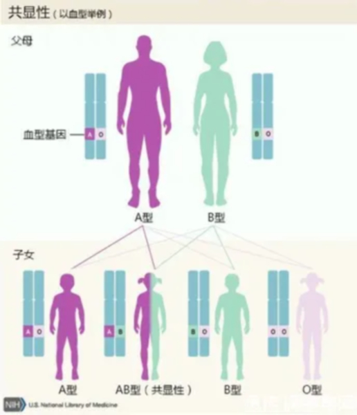 其中A和B基因是显性基因,O基因是隐性基因,当O基因遇到A、B基因的时候不表达。所谓显性遗传就是,两条基因链中只要有一条是显性基因,这条显性基因所携带的信息就会被表达出来。隐性遗传需要两条基因链同时为隐性基因,它们所携带的信息才会被表达。可以通俗理解成A、B基因比较强势,O基因比较弱势。