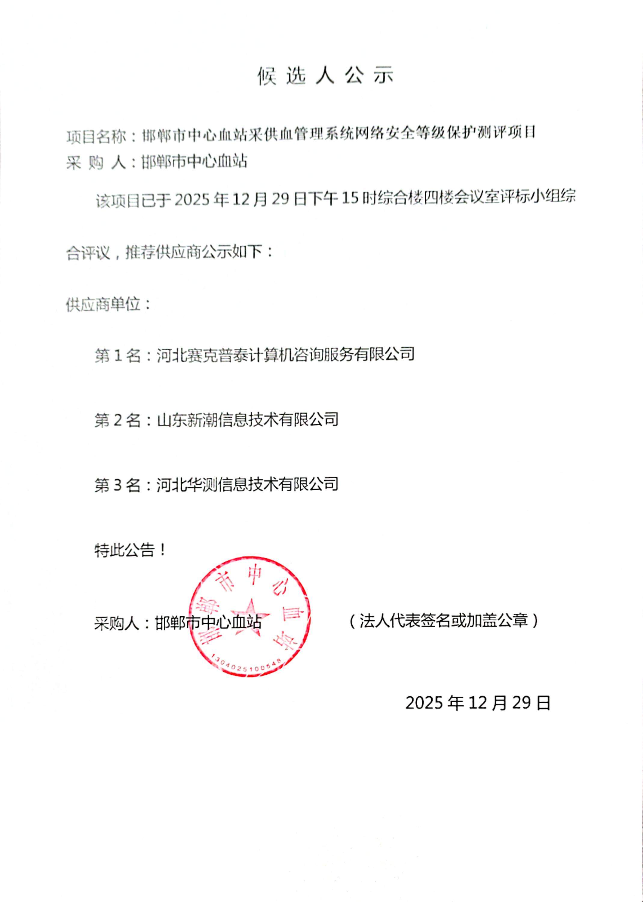 邯郸市中心血站户外高清全彩LED屏采购项目候选人公示