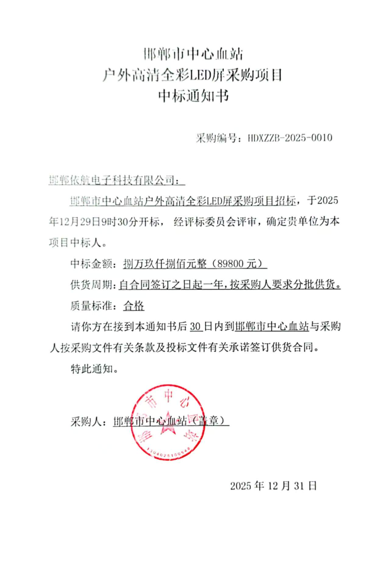 邯郸市中心血站采供血管理系统网络安全等级保护测评项目中标通知书